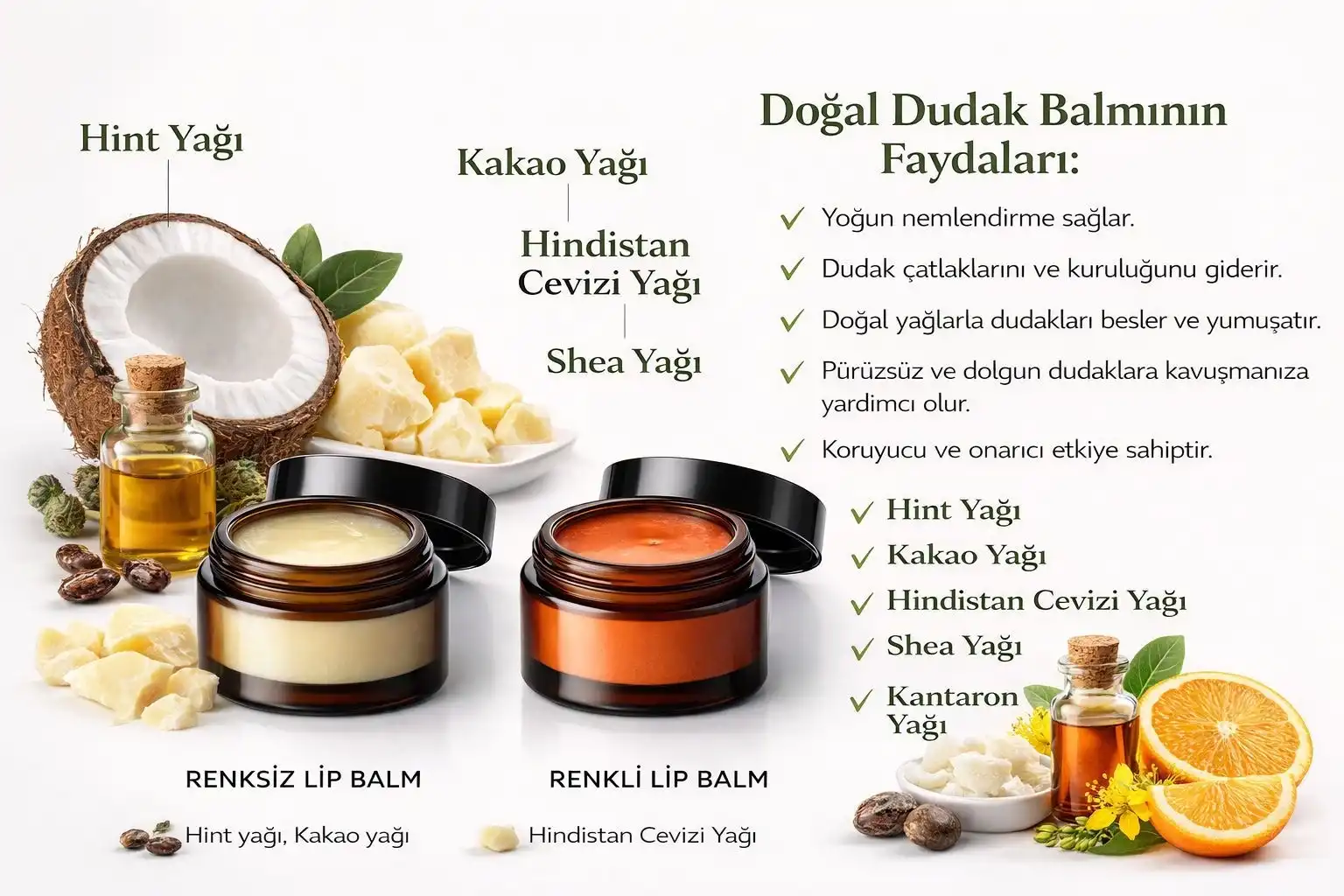 Hint yağı dudakları beslerken nem kaybını azaltır. Kakao yağı ve shea yağı dudak yüzeyini koruyucu bir tabaka ile sarar, çatlak görünümünü yatıştırmaya destek olur. Hindistan cevizi yağı dudaklara doğal bir parlaklık ve pürüzsüzlük kazandırır. Kantaron yağı ise hassaslaşmış dudakları sakinleştirmeye ve onarmaya yardımcı olur. Portakal yağı, balmın doğal ve ferah bir kokuya sahip olmasını sağlar.